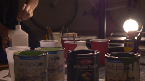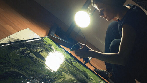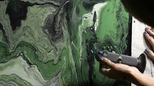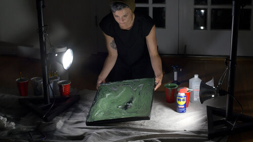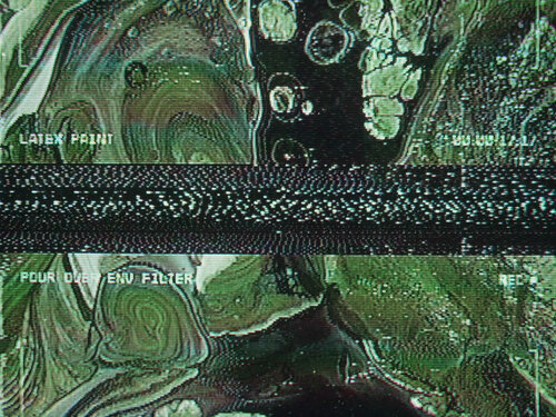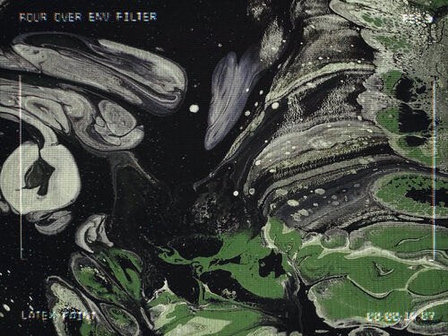 Each Segment of the Experiment represents a sort of tone each pedal filter can create. The Pour Over Envelope Filter creates an organic “wah-wah” sound, so in working with Peter Clark, we created liquid painting sequences that would mimic the undulating audio effect. In reference to the name, we poured paint onto black canvas to create psychedelic patterns that move past the camera. The Color palette kept to unique earth tones of greens and grays contrasted nicely with the black and white paints. I combined the latex paint with various varnishes and WD-40 to create the cell patterns effect. When combined with a blow torch, the WD-40 creates a burn affect, that can create a burning away and formation of cells at the same time, adding an extra level of organic movement to the paint.