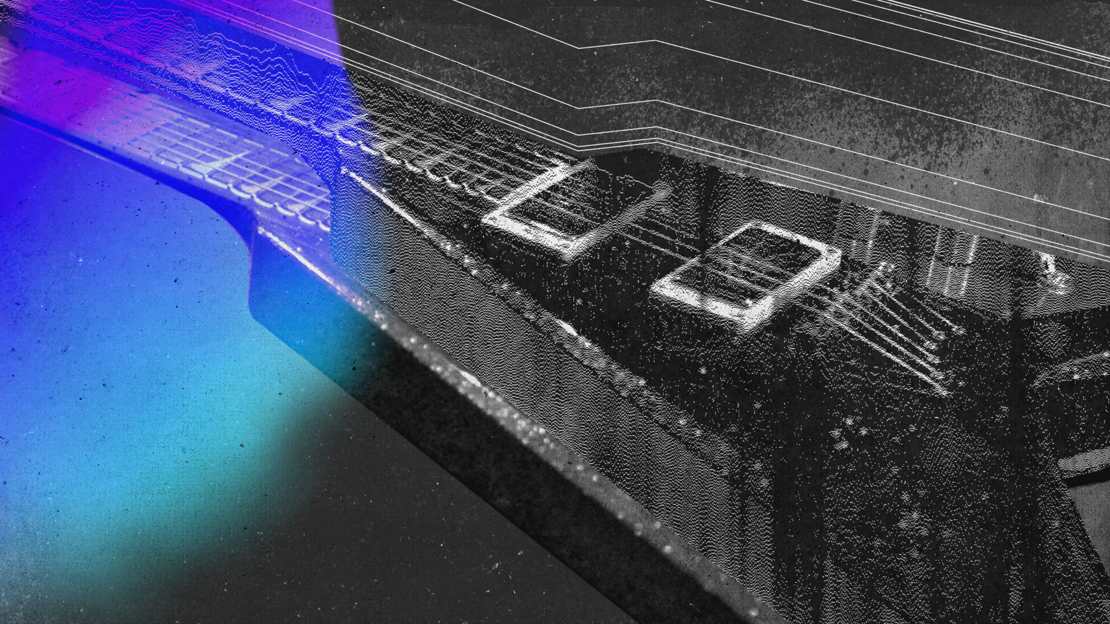 Imagining sound waves carrying us throughout the environments, the visuals connect instruments and band mates from shot to shot. To add to this textured, raw grunge feel, I brought a distorted, modulated glitch effect to the transitions of the elements and text, keeping us in this sporadic heavy metal vibe.