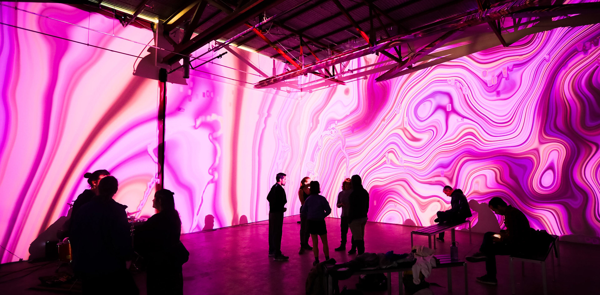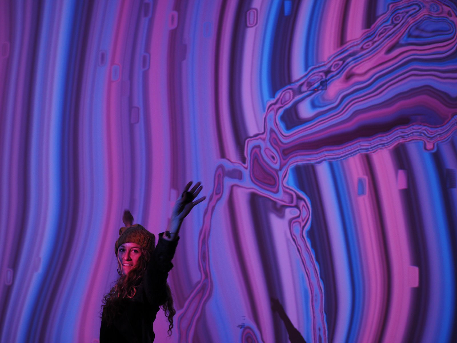 “In Melting Room, audiences play within an immersive mix of fluid and mineral dynamics, distorting and dragging fine-grained patterns with large-scale gestures captured by depth sensors. Inspired by Brittnie Diamant and Oilhack, marble and rock strata, wood grain, oil paint, river erosion, the visual system is continually generated in real-time using open-source shaders and melts and morphs over time and with the audience. Using Kinect sensors, people in the space are scanned and softly mixed into the visible patterns. Melting Room originally premiered next to Brittnie Diamant's paintings during Future Fires / Luminary at The Midway Gallery in San Francisco, California, in March 2017 and was made possible with help from World Stage and Epson.”
